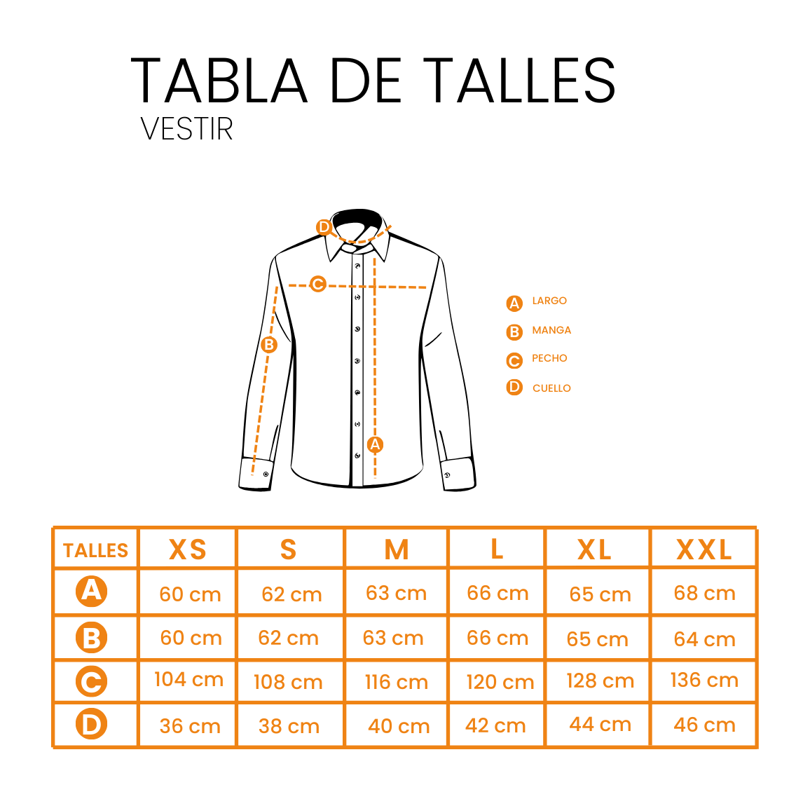 Para saber cuál es el talle correcto comparar las medidas que están en nuestra tabla sobre una camisa.